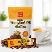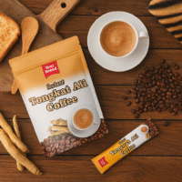 Instant Tongkat Ali Coffee combines premium coffee, standardized Tongkat Ali extract, and non-dairy creamer for a smooth, aromatic taste with a hint of herbal richness.
